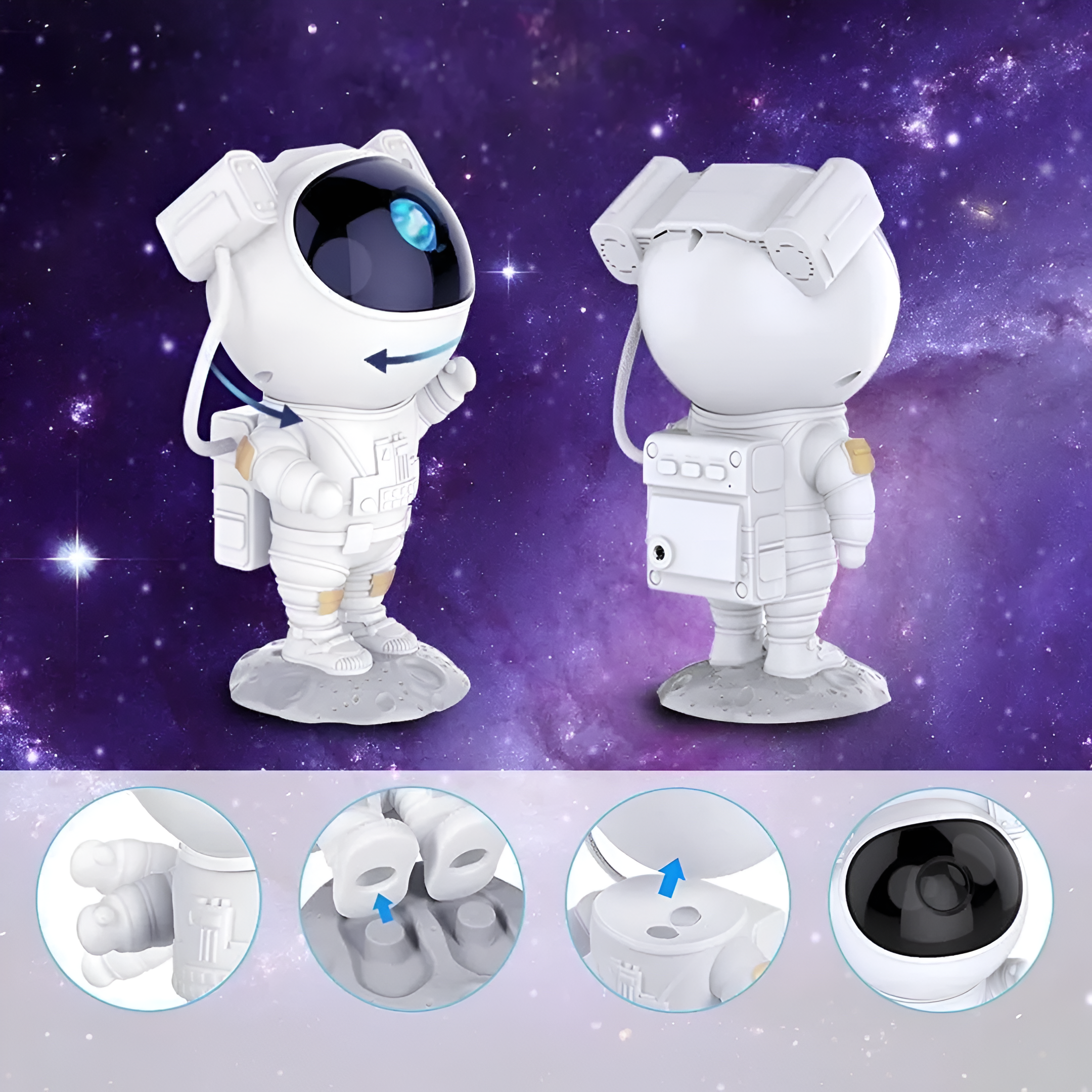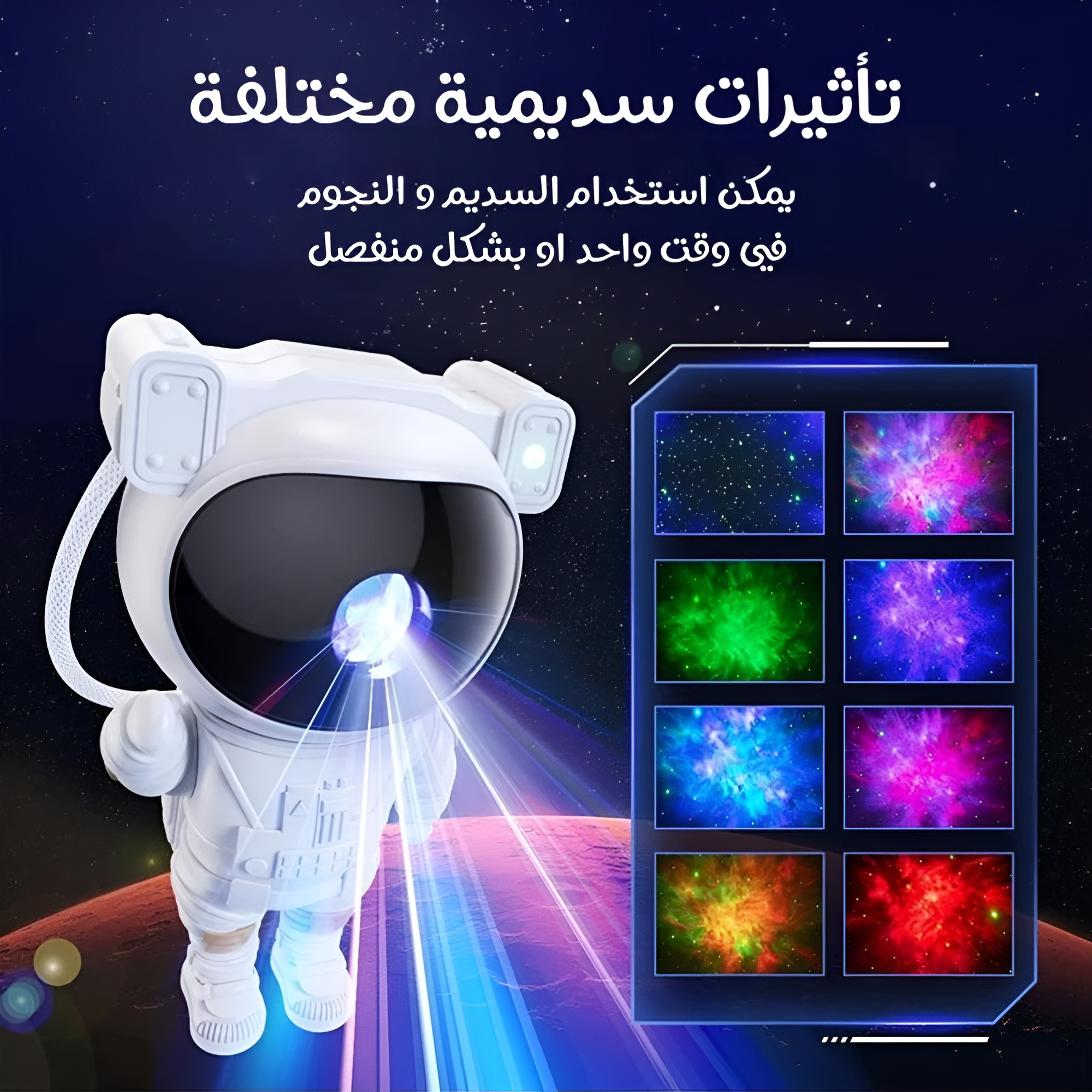فضاء لطيف ينبعث منه ضوء ملون من خوذته، يمكن التحكم به عن بعد بواسطة الريموت، ليُضفي أجواء ساحرة في الغرفة.